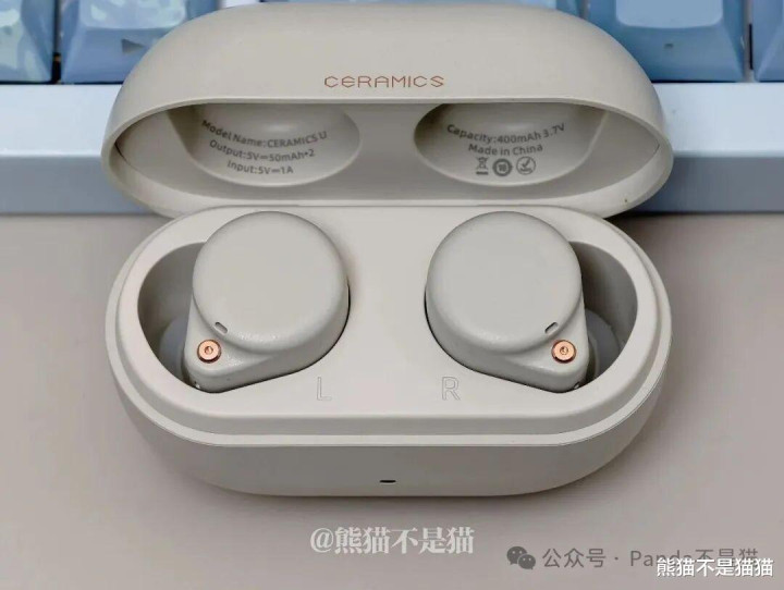 打开充电仓,顶盖内部印着部分设计参数:充电盒电池容量为400mAh,输入为5V1A,输出为5V50mA×2。此外,耳机与充电仓配色保持一致,表面的浮点设计也同样延伸到了耳机本体。