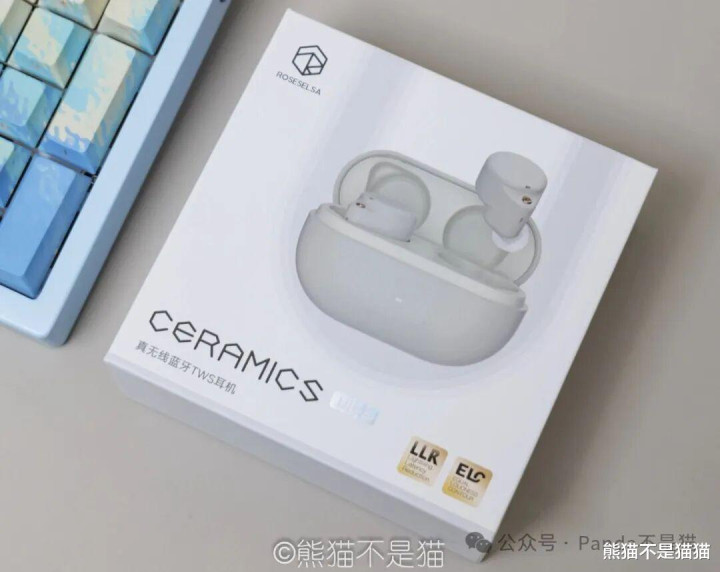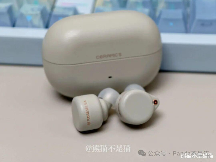 耳机依旧采用豆式设计,两侧印有弱水的英文Logo——ROSESELSA。耳机导管处有阶梯式的设计,大大减少涨耳感,佩戴也更加舒适。音腔内侧清晰标注了左右(L、R)方向。标配附带的是白色耳塞,但用户也可选配静谧套装,搭配降噪耳塞套,实现更优的降噪体验。
