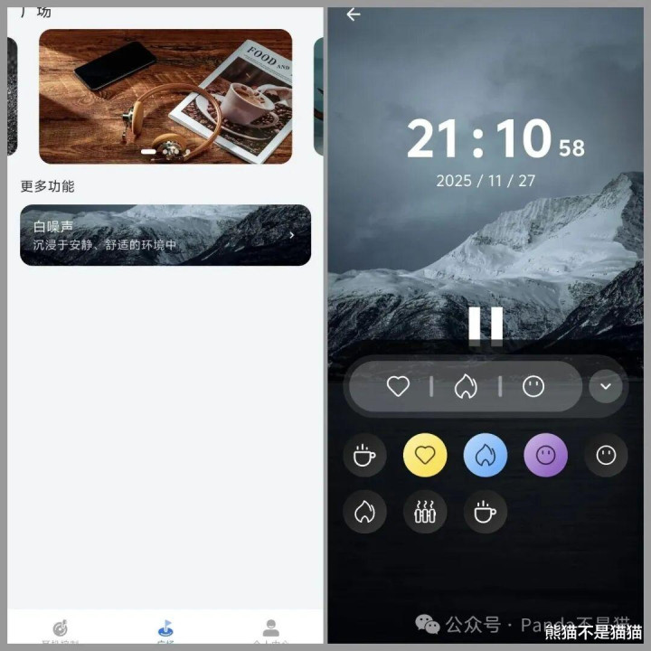 弱水时砂的APP设计极为简洁,除了耳机连接、控制和OTA升级功能外,唯一额外的就是广场里的白噪声,完全没有广告和任何推广,甚至自家产品也不例外,堪称业界清流。