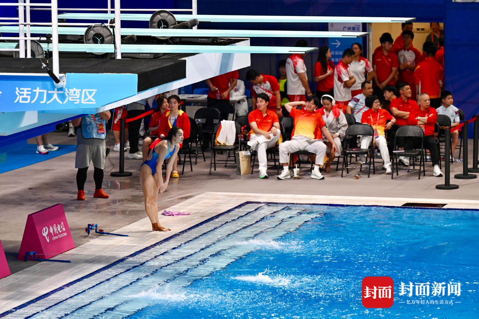 站在全运会女子3米板的跳板上,周围的竞争对手也都是“老熟人”,新搭档陈艺文、东道主“天才少女”林珊以及2016年里约奥运会10米台银牌司雅杰,“我觉得今天比赛发挥还是蛮正常的,从世锦赛结束以后,训练和平时的测验,质量和动作都不是太满意,今天这套算相对来说比较满意的,但比如说第一跳这些动作方面还是有些失误,回去也要总结一下。”在决赛中,陈佳的第一跳405B只得到了69分,是她全场5跳的最低分。不过,从第二跳开始,她逐渐找到了走板的感觉,分数直线上扬,第二轮的107B拿到了79.05分,同样的难度动作陈艺文是75.95分。凭借这一跳,陈佳从第二轮开始一直领跑榜首,直到第四跳林珊在107B中跳出80.60分的超高分后,领跑才戛然而止。“我其实看到林珊这跳的成绩后就知道冠军肯定会留在广东队了。”就如赛后发布会陈艺文所说,这个107B决定了冠亚军的归属。